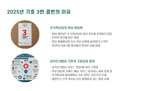 하지만 조국혁신당은 전략적 판단에 따라 대선 후보를 등록하지 않았고, 그 결과 기호 3번이 공란으로 남게 된 것입니다.