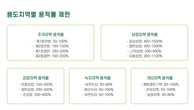 ※ 실제 적용 용적률은 지자체 조례에 따라 다를 수 있으므로, 해당 지자체의 도시계획 조례를 확인하시기 바랍니다.