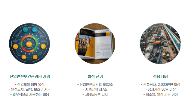 산업안전보건관리비는 산업재해를 예방하고 근로자의 생명과 건강을 보호하기 위해, 공사 또는 제조업 등의 작업에서 사전 안전조치와 교육, 보호구 지급 등을 위해 의무적으로 사용하는 비용입니다.