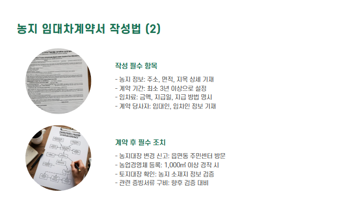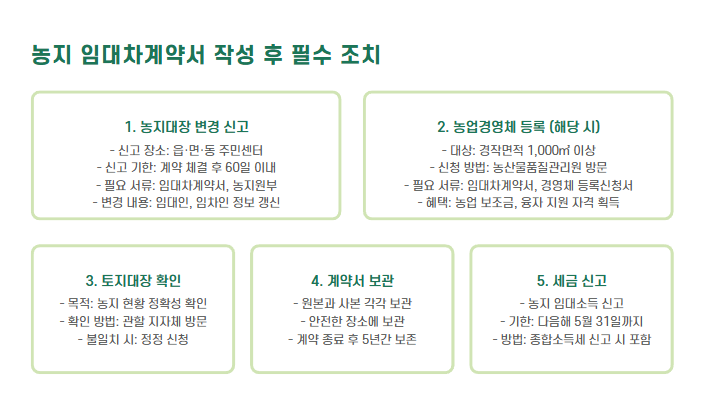 - 계약 후 농지대장 변경 및 농업경영체 등록 필수