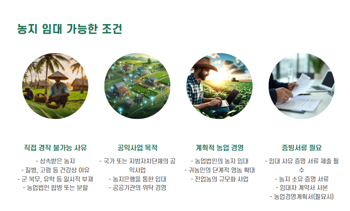 - 공익 목적이나 직접 경작 불가 사유가 있어야 합법 임대 가능