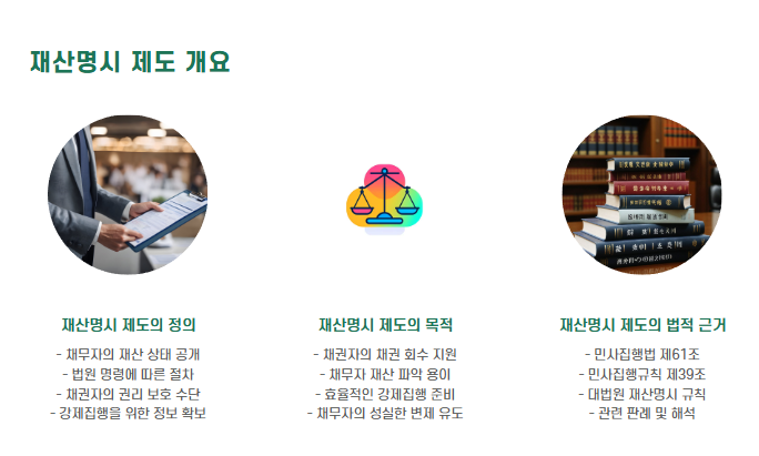 ‘재산명시 제도’는 채무자에게 법원이 강제로 재산 목록을 제출하게 해 채무자의 재산 내역을 확인할 수 있도록 하는 제도입니다. 채무자가 자산을 숨기고 있다고 의심될 때, 강제집행 전 단계에서 매우 유용하게 사용됩니다.