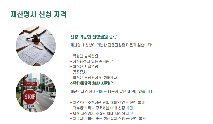 - 재산명시 신청 사유 (채무불이행 상태, 재산 은닉 가능성 등)