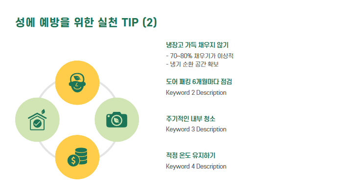 | 냉장고 가득 채우지 않기 | 냉기 순환 원활 |