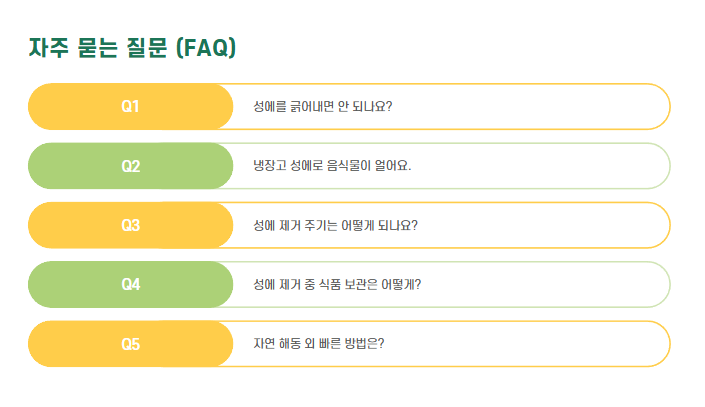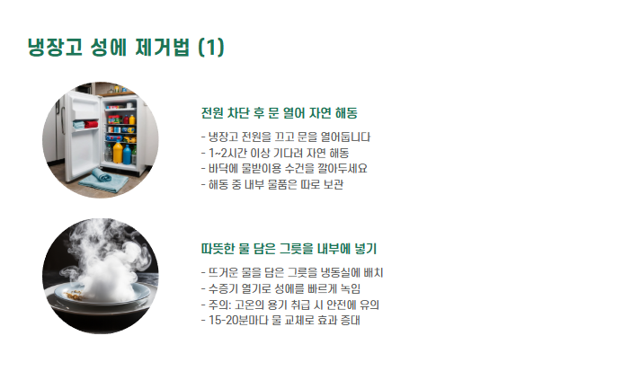 성에를 방치하면 냉장고 수명 단축, 전기세 상승, 음식물 손상까지 다양한 문제가 발생합니다. 오늘 알려드린 방법만 지켜도 성에 문제를 간단하게 해결할 수 있습니다. 지금 바로 냉장고 점검해보세요!
