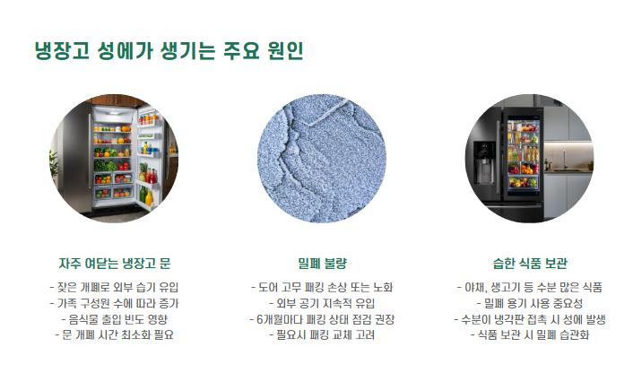- 가족 구성원이 많거나 자주 음식물을 꺼낼 경우 성에 발생 빈도가 높아집니다.