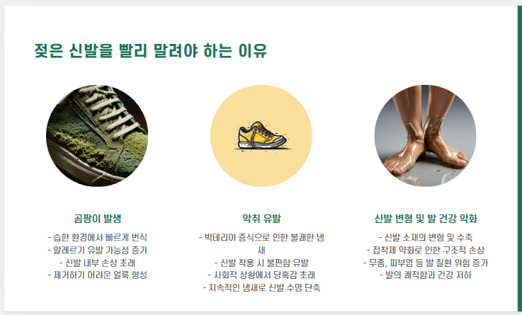 그런데 젖은 신발을 그대로 방치하면 곰팡이 번식, 악취 유발, 신발 변형 등 생각보다 심각한 문제가 생깁니다.