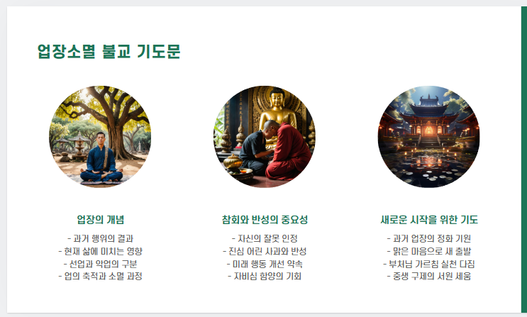 - 예: “모든 업장은 나의 잘못에서 비롯되었사오니 깊이 참회하나이다.”
