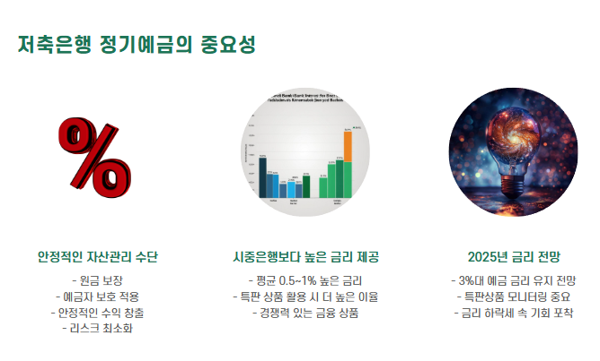 2024년 하반기부터 기준금리는 점차 안정세를 보였지만, 여전히 고금리 유지를 원하는 서민층의 수요는 높습니다. 금융 전문가들은 2025년 상반기에도 3%대 예금 금리가 유지될 가능성이 높다고 보고 있습니다.