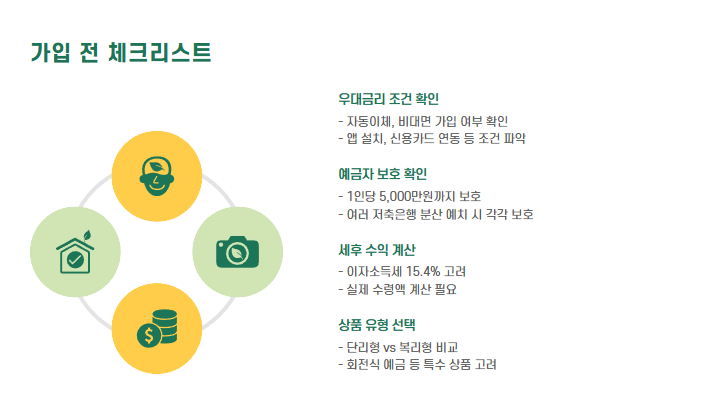 - 우대금리 조건: 자동이체, 비대면 가입 여부, 앱 설치 여부 등 조건 충족 필수!