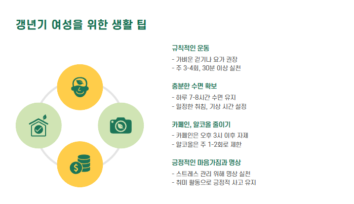 하루 30분 정도의 가벼운 걷기, 요가, 스트레칭은 혈액순환을 촉진하고 기분을 안정시키는 데 도움이 됩니다. 특히 요가는 안면홍조나 불안감 완화에 효과적입니다.