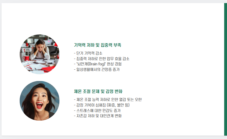 집중력이 떨어지고, 자주 깜빡하거나 말을 잊는 일이 잦아집니다. 일상생활과 업무에 영향을 줄 수 있으며, 심리적 위축을 동반하기도 합니다.