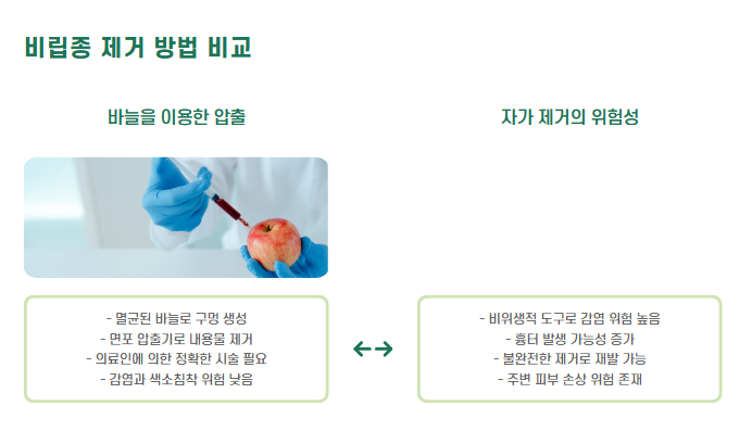 시술 자체는 간단하지만, 제거 후 피부가 예민해질 수 있으므로 회복 관리가 매우 중요합니다.