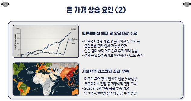 - 미국의 무역 정책 변화와 지정학적 긴장으로 인해 안전자산으로서의 은 수요가 증가하고 있습니다.