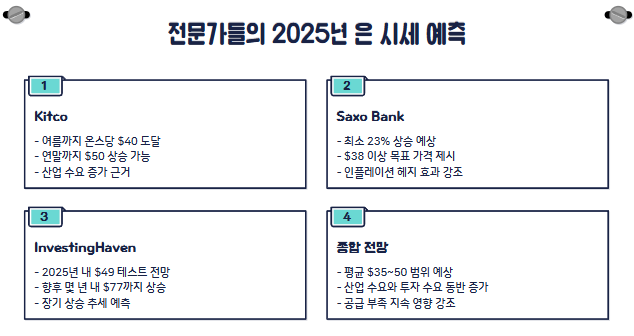 - 전문가 예측: 2025년 말 온스당 $35~$50 가능성