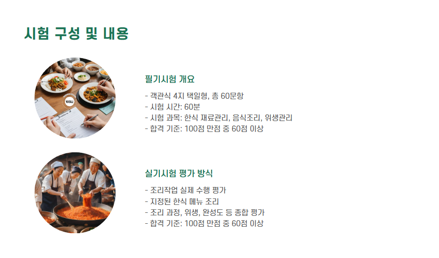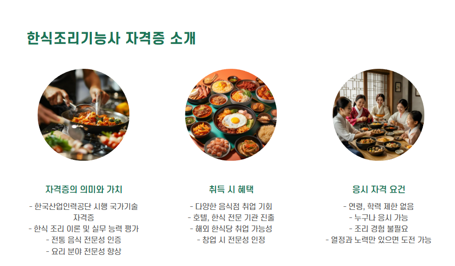 한식조리사 자격증은 한식 분야에서의 전문성을 인증하는 국가기술자격증으로, 조리 분야에 관심 있는 분들께 유용한 자격입니다.