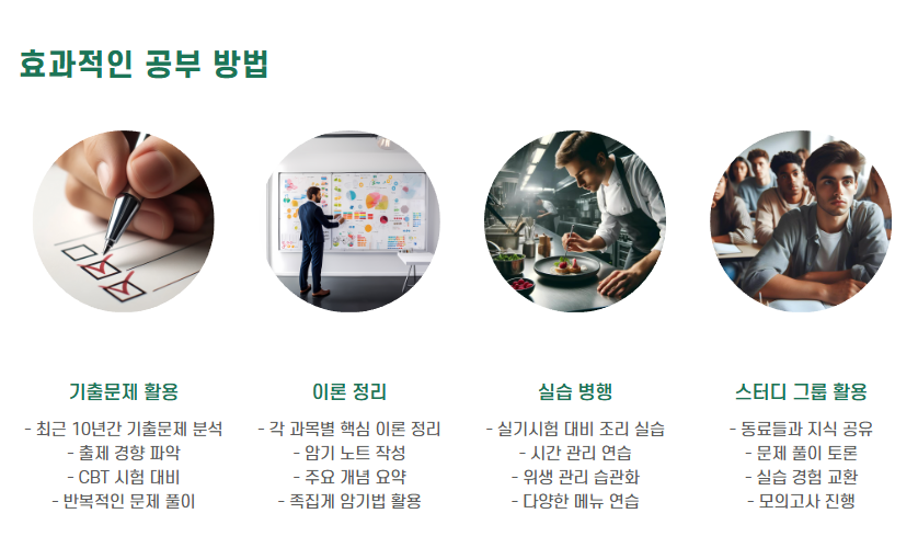 - 예를 들어, '육류 보관온도'나 '칼의 종류' 등을 이론으로만 외우지 말고 실습할 때 직접 적용해보세요.