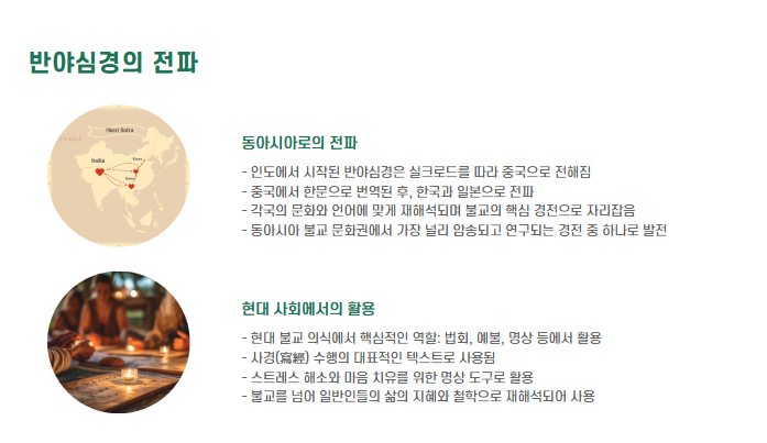 - 인도 → 중국 → 한국과 일본으로 이어졌고, 지금은 법회, 예불, 사경, 명상 등에 널리 활용