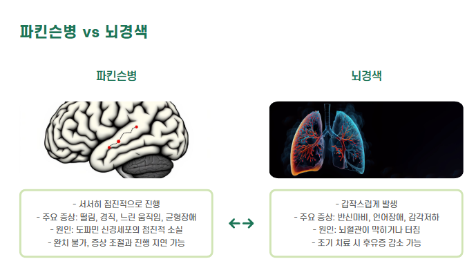 | 주요 증상 | 떨림, 경직, 느림, 균형장애 | 반신마비, 언어장애, 감각저하 |
