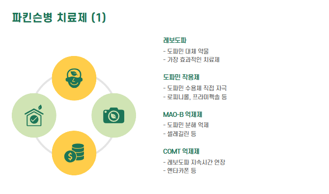 - 레보도파(Levodopa): 도파민 대체 약, 가장 효과적