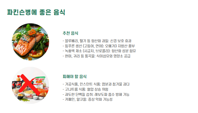 건강한 식단은 파킨슨병의 증상 완화와 전반적인 뇌 기능 유지에 도움을 줍니다.