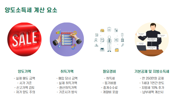 양도소득세 = [(양도가액 – 취득가액 – 필요경비 – 기본공제) × 세율] + 지방소득세