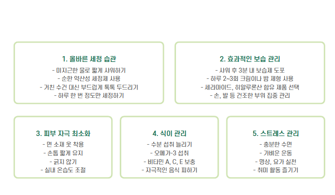 – 즉각적인 보습 관리 + 원인 차단(자극, 환경)이 가려움 해소의 핵심입니다.