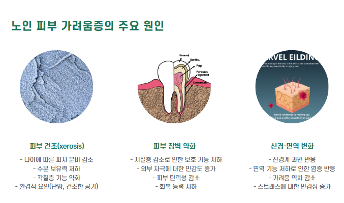 나이가 들면서 '피부 가려움증'을 경험하는 어르신이 많습니다. 특히 피부 수분 감소와 장벽 약화로 속건조 상태가 되기 쉬워, 작은 자극만으로도 가려움이 심해지기 쉽습니다.