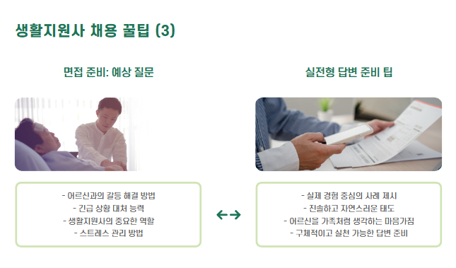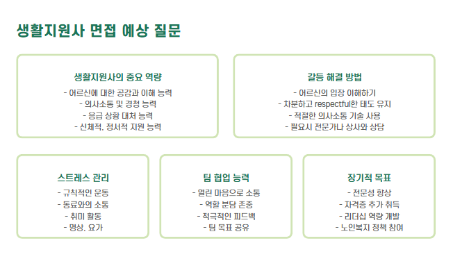 생활지원사 면접에서는 기술보다는 사람에 대한 태도, 정서적 공감, 책임감을 중시합니다.