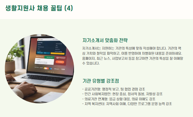 기관마다 추구하는 서비스 방향이나 이용자 성격이 다를 수 있기 때문에, 자기소개서는 다음을 반영해 맞춤 작성하세요: