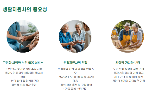 생활지원사는 단순한 직업을 넘어 사회적 가치와 보람을 느낄 수 있는 직무로, 중장년층의 재취업 분야로도 각광받고 있습니다.