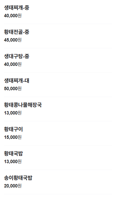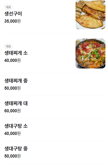 추천 메뉴: 생선구이, 생태찌개, 황태구이