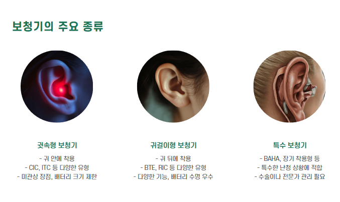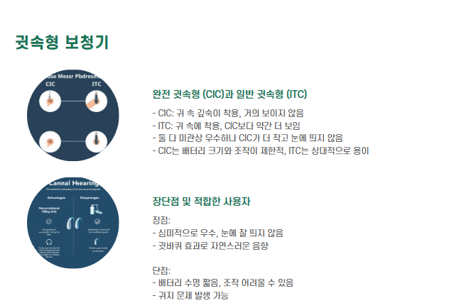 | 귓속형 (CIC/ITC/IIC) | 심미적·작고 눈에 안 띔 | 배터리·조작·귀지 문제 | 경도~중도 난청, 외관 중시 소비자 |