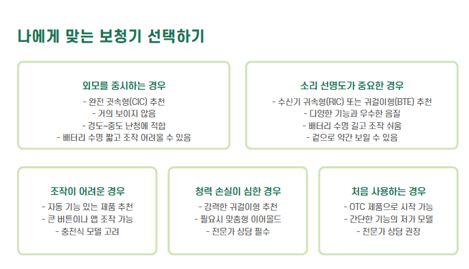 | 보청기 처음 써봐요 | 간단한 OTC 제품 또는 전문가 상담 추천 |