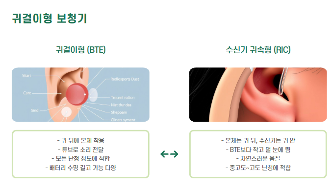 | BTE/RIC | 기능·배터리·소리 품질 우수 | 바람 소음·다소 눈에 띔 | 중~중증 난청, 활동이 많은 사용자 |