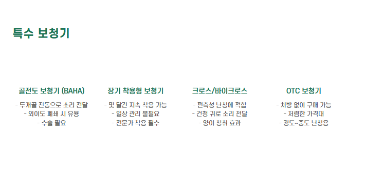 | BAHA/중이 임플란트 | 구조적 난청 해결 | 수술 필요, 비용 및 관리 부담 | 외이도 기형 등 비순행성 난청 환자 |