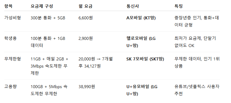 ✅ 알뜰폰 요금제 비교표 (2025년 기준)