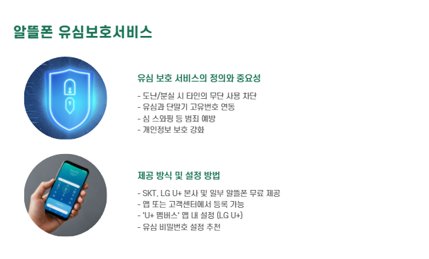 유심 보호 서비스는 도난이나 분실 시 타인이 유심을 무단으로 사용하거나 변경하지 못하도록 차단하는 보안 기능입니다.