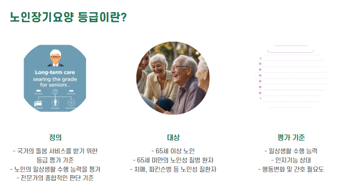 노인장기요양 등급은 65세 이상 노인 또는 65세 미만의 노인성 질병(치매, 파킨슨 등) 환자가 국가의 돌봄 서비스를 받기 위해 필요한 등급 평가 기준입니다.