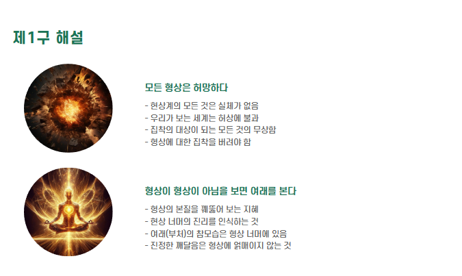 이 구절은 **눈앞에 보이는 모든 형상(모양, 외형, 사건)**이 본질이 아니라는 가르침입니다.