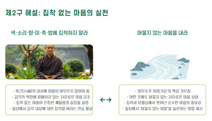 “색·소리·향·미·촉·법에 집착하지 말고, 머물지 않는 마음을 내라.”