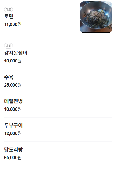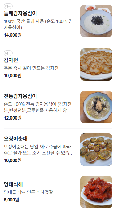 - 대표 메뉴: 들깨감자옹심이, 감자전, 오징어순대